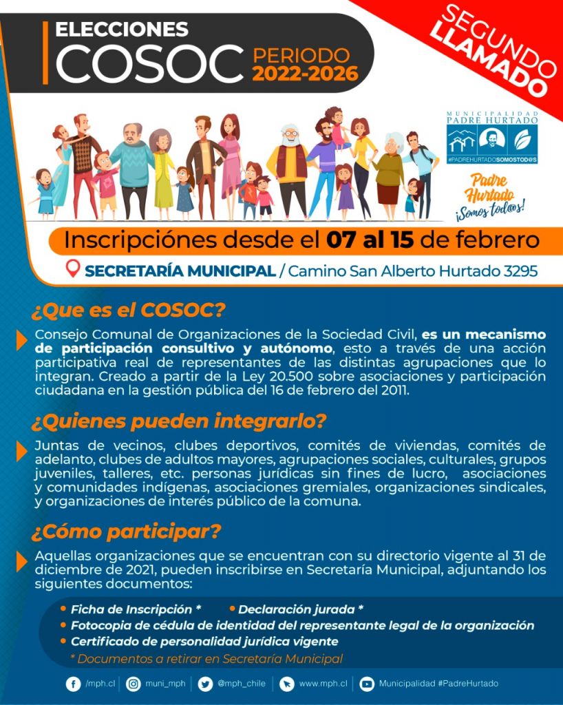 SEGUNDO LLAMADO ELECCIONES COSOC 2022 0 By Sergio Cardenas on enero 31, 2022 · Noticias DESCARGA LA DOCUMENTACIÓN ADJUNTA AQUÍ: proceso escaner PROCESO-COSOC 2022 LISTADO OR (1) #padrehurtadosomostodos Compartir. Twitter Facebook Google+ Pinterest LinkedIn Tumblr Email