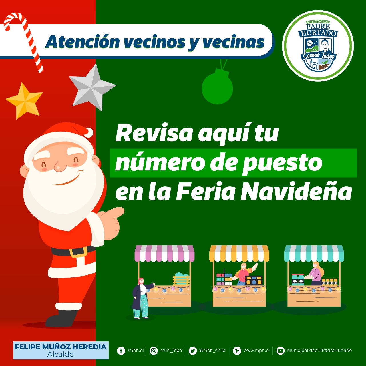 Vecinas y vecinos ya están disponibles los números y las ubicaciones de la Feria Navideña que comenzará este jueves 8 de diciembre a las 18 horas en la Calle Ignacio Carrera Pinto.
